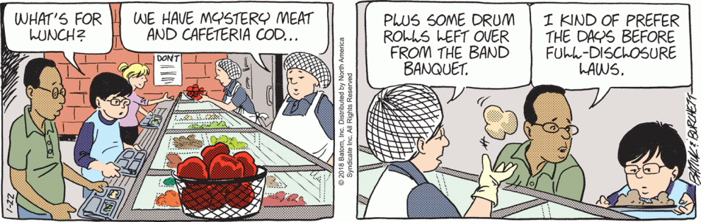 How bad was the past week of Les strips? Bad enough to make today’s appearance by Mister Kablichnick feel like a refresing palate cleanser. I was ready to add “doughnut of doom” to the Batiuktionary, figuring that the term was coined by TB to set up the “punchline.” But Grandpa Google turned up this April 2019 New York Times article that uses the phrase, as well as the image Jim that is showing the students.