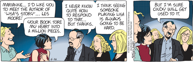 “Lisa’s Story” is just like the video cartridge in “Infinite Jest”, once you start reading it you’re unable to do anything else but think about Lisa until you wither and die. Naturally with Les being Les and all, he can’t even accept Marianne’s sincere compliment without taking a dig at Cindy, because she was the popular girl in high school who looked down her nose at him and etc. And it’s funny because never letting go of old high school grudges is hilarious, I guess. Look at that snide look on his smug bearded face in panel two, he’s genuinely enjoying watching Cindy squirm. What a dick.