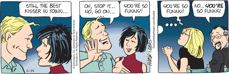 It’s really stupid, though and more than slightly, uh, reductive, I guess. Mason sees Cindy cozying up to Les and doesn’t give a damn, Cindy sees Mason chatting with a co-star and she’s boiling with hateful fury within seconds. Sure, I admit it, I notice when there’s cleavage in the strip but next to the guy who writes this thing I’m like freaking Gloria Allred. He took the most traditionally “successful” character (male or female) in the strip and turned her into an insecure teenager, strictly for laughs. Attempted laughs, that is.
