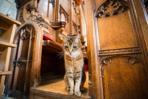 But with roughly 20 percent of people having some level of allergic reaction to cats, I had a hard time believing that any church would risk annoying congregants and turning away potential parishioners by letting a feline frolic through the foyer. On the other hand, Tom steals more story ideas than Shakespeare, there was a good chance he’d come across some fluffy choir cat story on the news. So I went on a quest to find church cats.