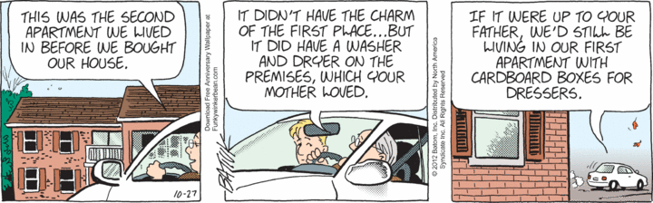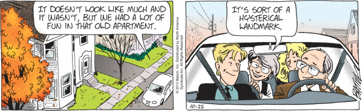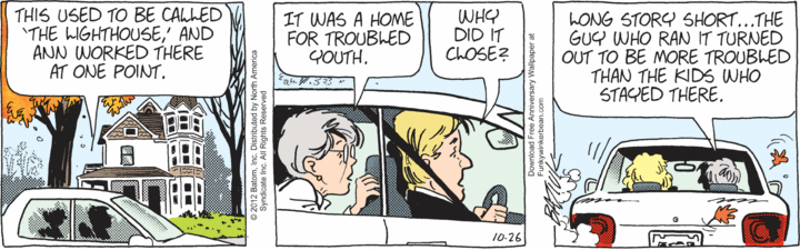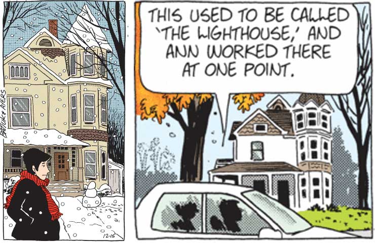 I’m embarrassed to admit I immediately recognized the house in today’s panel 1 as “the Lighthouse.” It was another site that Fred and Ann pointed out ten years ago as they took Darin and Jess on their impromptu nostalgia tour. It was formerly “a home for troubled youth” where Ann had worked early in her career. Maybe the locale stuck in my head because of Ann’s ominous answer when asked by Darin why it had closed: “Long story short…the guy who ran it turned out to be more troubled than the kids who stayed there.”