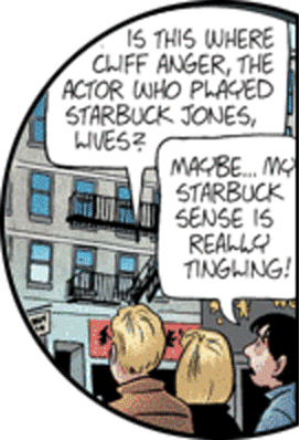 But now down to business. When we last left the Dynamic Trio yesterday, it looked as if Cindy was going to jump to her death, thus ending her misery of appearing in this comic strip. Today we see no such luck. She has in fact climbed on to the fire escape to try to communicate with the legend that is known as… Cliff Anger.