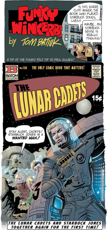 Meanwhile Cindy is communicating to Cliff through the window. Either that or she has breathed on the glass and is now drawing doodles on the fogged surface. In the last panel we see that Pa Winkerbean has wandered away from the nursing home and has answered the phone at Montoni’s. He – what? That’s supposed to be Funky answering the phone? Huh. Anyway, the audience gets a side-mouthed smirking retort at the expense of Cindy. Otherwise known as business as usual with this comic.
