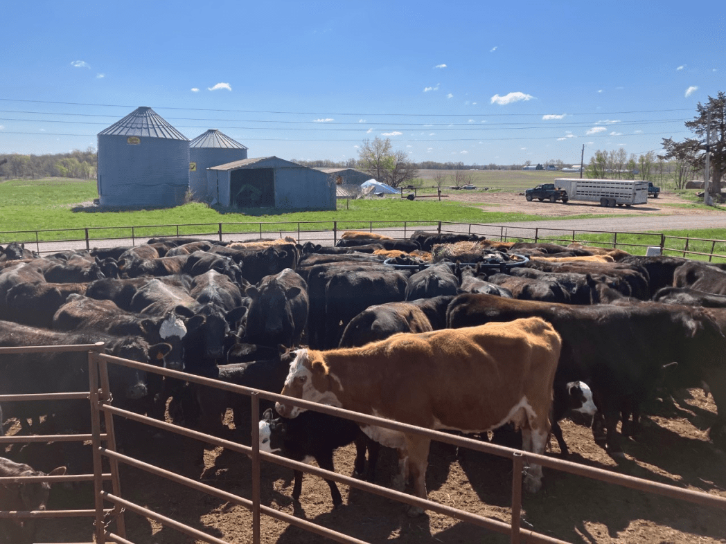 The calves sorted off in our little calving shed. We haul them separate from the cows in just case a calf slips in the trailer. Don’t want the little babies squished! The one in the very front has a funny spot on his nose, probably from some Simmental genes.
