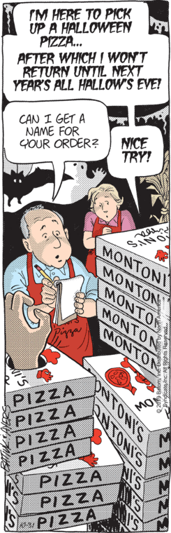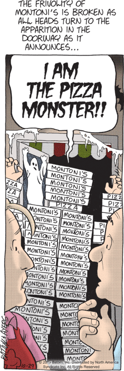 Today’s strip was not available for preview, but thanks to Fearless Leader’s diligence, we got a tiny glimpse of it. Looks like the pizza monster has obtained his yearly token of appreciation and left in a hurry. And there’s some speculation as to the identity of the fiend, with guesses of Crazy Harry and John, and a request for the monster operator’s initials.
