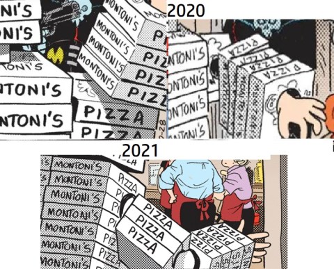 By the same token, we can rule out Tony, Donna, Dinkle, Harriet, a magically rejuvenated Crankshaft, and Chester Hagglemore. They’re all just too portly, old, or both to make this costume work. Especially since, on average, the Montoni’s Pizza Monster seems to use less boxes than Luigi’s.
