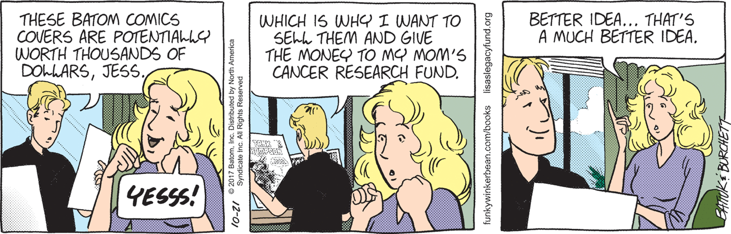 The “Dibbs Gallery” marquee tells us this is Kitch Swoon, who was last seen at Atomik Komix handing out nice-sized checks. Apparently she’s hired the new-look Summer as an assistant. It also looks like Tom Batiuk went through a Roy Lichtenstein phase about a year ago, because this is his second mention in a month. The wedding sign Darin made was a blatant copy of Lichtenstein’s famous work “Crying Girl.”