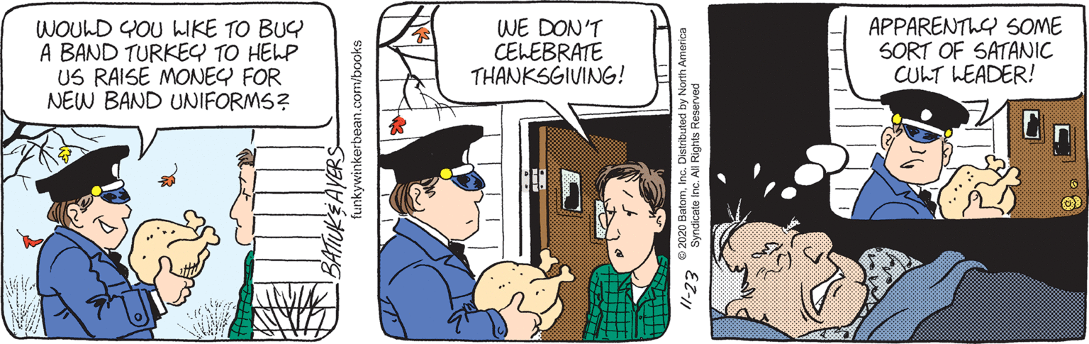 You know who else suggested that the wild turkey, not the bald eagle, should be the national bird of the United States? Not Ben Franklin, according to Auntie Wikipedia. Perhaps Dinkle knows this, and he’s delivering the “national bird” remark satirically. This is supported by the fact that he’s smirking so hard when he says it that his mouth threatens to escape his face. But wait, here comes the punchline and…it’s…Butterbald? Hell no, I’ve never heard of a Butterbald Eagle. Or a “Butterbald” anything! Did Batty feel that the good people at Butterball® LLC wouldn’t be OK with a free mention in 400 newspapers right before Thanksgiving? Batiuk’s propensity for coming up with jokey, soundalike “brand names” once again tramples what would have been a borderline decent gag.