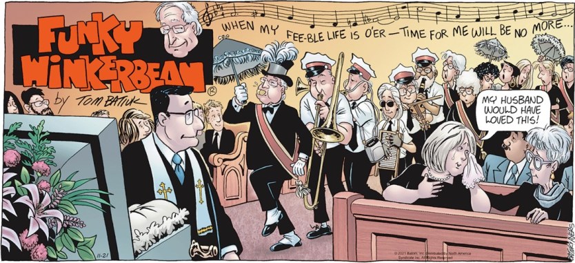 Look, I’m just going to gloss over the fact that Dinkle was actually introduced well over a year into this strip’s existence and just give TB credit for remembering that Funky Winkerbean itself is 47 (and a half) years old… And with that out of the way I’ll go right into wondering what the heck this has to do with Bull, his condition, his life, or anything. I guess if you twist your neck 117 degrees and squint until you experience sharp pain in your temples it appears the notoriously egotistical Dinkle (or is that Buck?) is paying Bull a compliment by saying they were equals despite his long and incessant history of considering all things inferior to himself and his marching band. But really this is just TB repackaging his biggest hit.