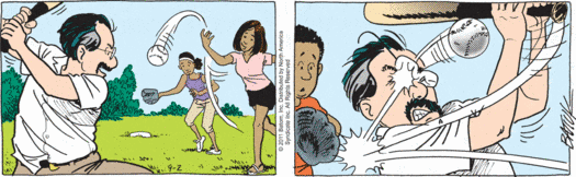 Labor Day 2011: At Cayla’s family picnic, Les fouls a softball off his face.