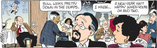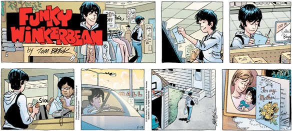 Here is Funky’s idea of showing his father a good time on Fathers’ Day: schlepping him to the food court at Mammoth Mall. What do you expect from the cheap bastard who celebrated his wedding anniversary at Montoni’s? Hell, Montoni’s would’ve been a nicer place for lunch than the crowded, noisy food court. Their “nice chat” consists of poor Pa’s persistent proffering of his too-big sandwich, and Funky’s polite refusals. Batiuk might have used today to have Funky at least attempt a conversation with his father, and given the reader some kind of insight into this relationship, rather than using the old man as a prop to make us feel sorry for Funky.