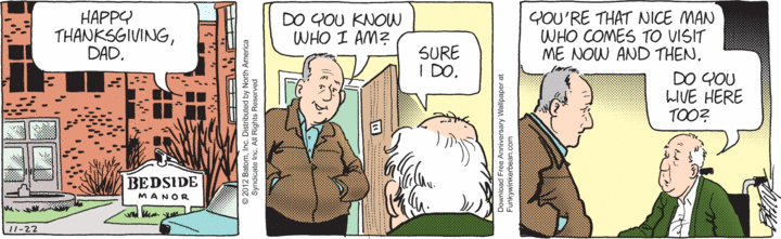 Readers have surmised by now that, in a Funkiverse where people avoid expressing joy lest they tempt cruel fate, the holidays are occasions to ratchet up, rather than leave aside, despair. Having decided that it’s too taxing to take Dad out of the home for the holidays, Funky contents himself with paying the old man a visit “now and then”. Pop may not recognize his only son, but you can’t blame him for thinking that this “nice man” must live in the nursing home too: he certainly looks to be of age.