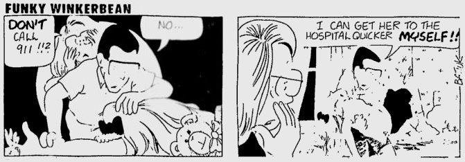 I took a look back at the last time this strip teased a suicide, the infamous Susan Smith story arc from mid-1995. Was it any better than this current story arc? Well, yes and no. Yes, because it involved a teenage social outcast who had a well-established and unhealthy infatuation with a teacher rather than a popular actress with a background as deep as a tide pool… and no, because that teacher was Les. Also no, because TB was using those wavy borders I griped about all last week improperly even back then, when cutting from Les and Co. to Susan looking sad in a different setting.