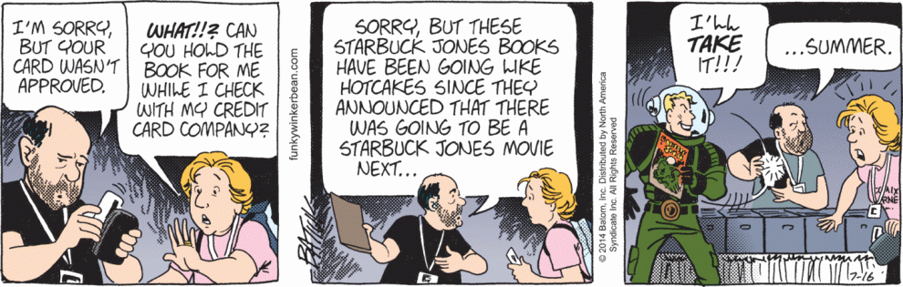 So… um… uh… OK, I had a point to make about today’s strip, but I keep getting distracted by Skyler’s unnervingly tiny hands. In the first panel they look like Lyman from Garfield‘s mustache and the one in the second panel looks like Donald Trump in profile. Look, I get it, hands are hard to draw. I draw hands especially poorly, to be honest, but I really try not to make them creepy and distracting.