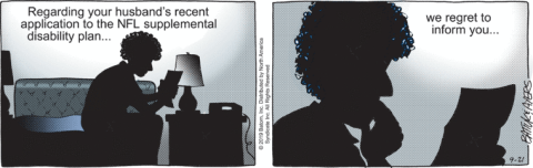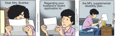 Mind you, this was Funky Winkerbean‘s final “prestige arc”, about the death of Bull Bushka from football-induced CTE. A too-minor and yet too-major subplot was about Linda seeking payment under the NFL’s real-life settlement plan for CTE sufferers, without Bull ever knowing about it. It was never explained why she needed this money; we saw the Bushkas do things like travel long distance for health care they could have gotten locally. Nor was it spoken of again after this.