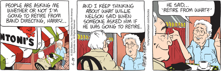 I donned my PPE and took a deep dive into the Act II archives for a refresher about the circumstances surrounding Dinkle’s “retirement.” Near the end of Act II, Becky Winkerbean, as she was known then, took over as band director when Dinkle was promoted to WHS’ music supervisor. His actual retirement happened “offscreen,” during the second 10 year time jump. Shortly thereafter, his beleaguered wife Harriet pleaded with, and possibly bribed, the school board president to install Harry as director of the performing arts center that bore his name, just to get him out of the house. It’s doubtful whether that director role entails hanging around the high school and basically serving as Becky’s co-band director. Look at him smirk in panel 3 at his friend’s quip. Harry Dinkle doesn’t know the meaning of retirement. No, seriously…he doesn’t know the meaning of retirement.