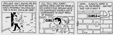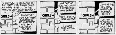 ‘Average’ is the first bit of characterization Funky was given, and as far as I can see it held true through 20 years of high school. You’ve got to give him some credit for keeping Les as his best friend, since nothing probably dragged him down Cindy’s popularity rankings more than having human tumor Les Moore clinging to his side.