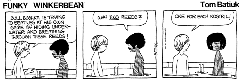 Unless this is some kind of Sunday fake-out, it would appear that the John Darling handgun arc is finally, mercifully, over. That was weird. So anyhow, today BatYam aims his always insightful and cutting wit at leaf blowers, and how much they suck. Real topical there, Pulitzer (nominee) Boy. I could point out that Funky obviously hired the landscaping crew because he didn’t feel like raking the leaves himself, thus making him quite the hypocrite, but whatever. It’d totally kill the melancholy, depressing vibe he was going for here, and Lord knows I wouldn’t want to do that.