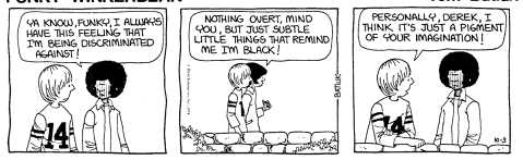 I’m guessing that this was intended by the author to reference the one or two strips where he felt ‘alienated’ by his race. He was one of a few black students in a mostly white school. So obviously (sarcasm) asking him if he felt left out is silly.