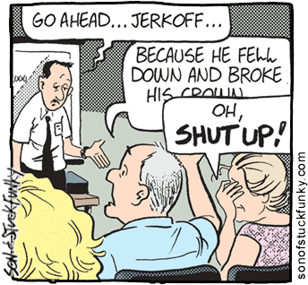 Everybody in the room needs to come to the poor bastard’s defense. Seminar Guy is desperately tries to engage with anyone here whose name is not Funky Winkerbean, but he’s the only one with his hand raised. As cringe-y as this week has been to date, at least