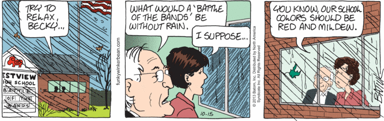 The day of the big alumni band Holly and Melinda Budd vanity performance has arrived in today’s strip, and the nastiness continues. No, I’m not talking about the weather, though most of us are aware that monsoon rains during band performances are quite possibly the longest still-running gag in this strip (predating even Garfield and lasagna/Mondays, though far far less accessible).