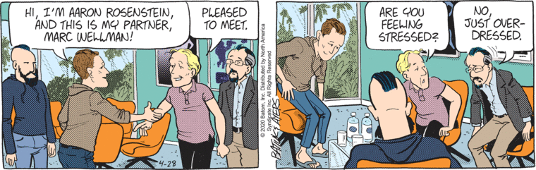 Yet another instance of Batiuk’s famous one-year leadtime biting him in the ass. I thought this was a “pitch” meeting, but apparently these dudes have already had a chance to read the film treatment. Guess Mason and Les are about to learn that Hollywood is reluctant to make a movie that might not sell tickets overseas. Remember the expression “But will it play in Paducah?” Now they’re worried about how it will perform in Panjin.