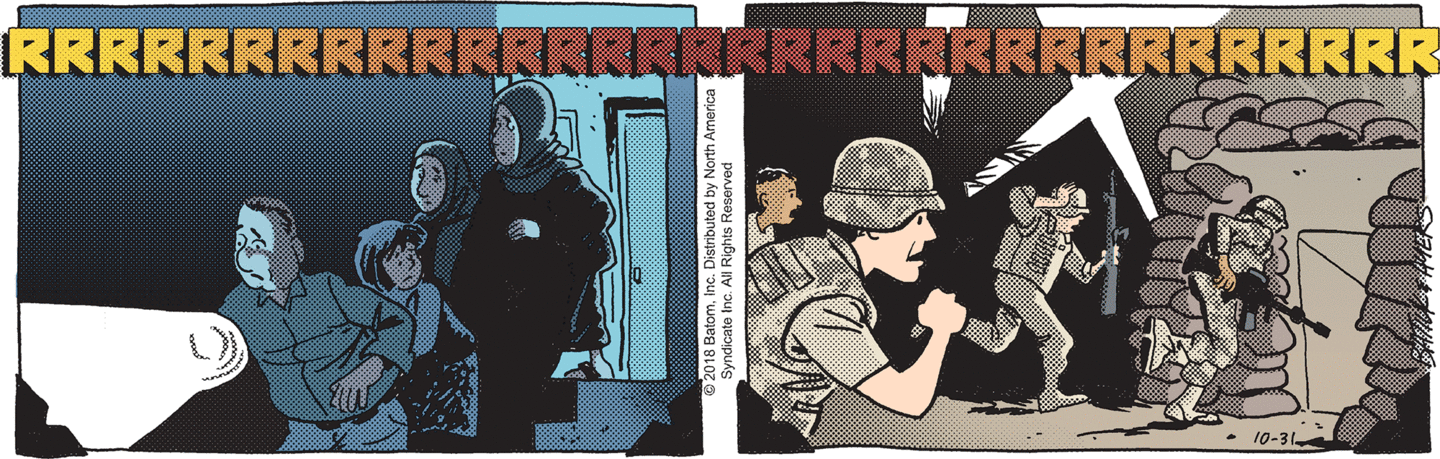 I’ve had the impression that there’s nothing more in Rocky’s backstory than “was in the Army”, and today’s strip really confirms that. Apparently the only outfit she has ever worn is camo. I mean, yes, I know anyone in the military gets used to dressing a certain way, but literally no other information about Rocky has ever been provided other than “met Cory in the Army”.