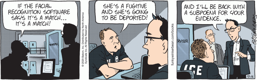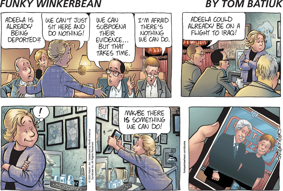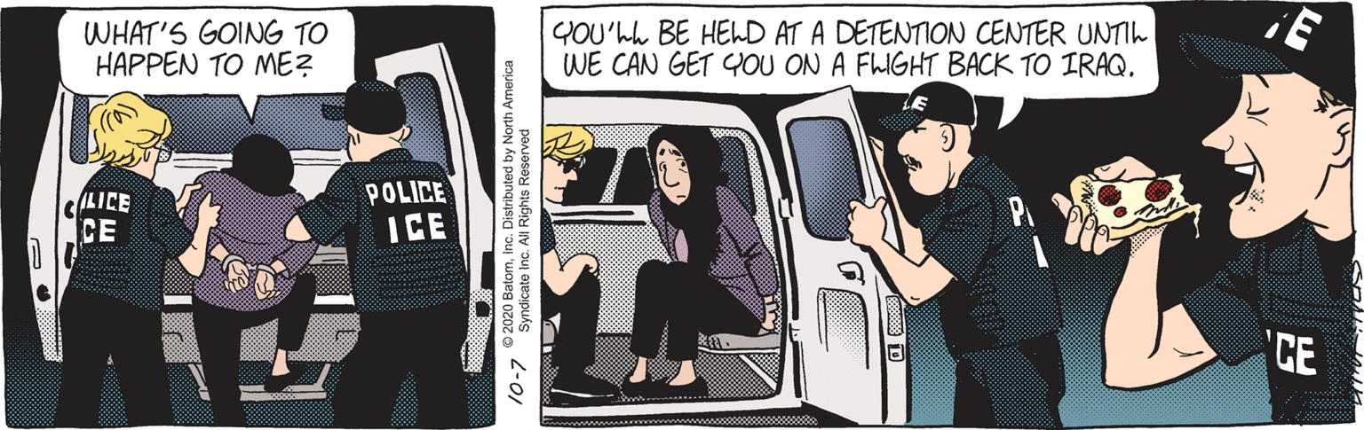 The ICE agent snacking on the pizza represents the cold soulless hand of an unfeeling bureaucracy and so forth. Sigh. Obviously Adeela needs to get in touch with The Gang in order to straighten this unfortunate kerfuffle out, but her phone is bricked, so I dunno. It’d be way funnier if they really did ship her off to Iraq on the 8:15 out of Columbus but I seriously doubt she’s going anywhere except (sigh) back to Montoni’s, where she’ll make some sort of weakly wry quip about how she’s still better off in Westview.