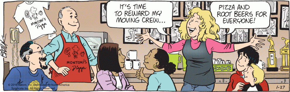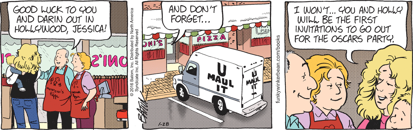 Let’s hope the prospective Mr. and Mrs. Jarre and Mr. and Mrs. Anger get back from the courthouse in time for the World Premiere of Starbuck Jones! The studio’s pulled out all the stops, installing huge inflatables of Starbuck, Jupiter Moon, and a Xanax Warrior atop the Val’s crumbling marquee, while the “front of house,” which just last week was brown, appears to have been repainted the same blue-gray as the drab balloons at that kid’s birthday party. Here’s hoping that the life-sized SJ and Jupiter we see waving to the crowd are costumed players; to have the movie’s leads cosplaying themselves at the world premiere would be too cheesy even for Batiuk.
