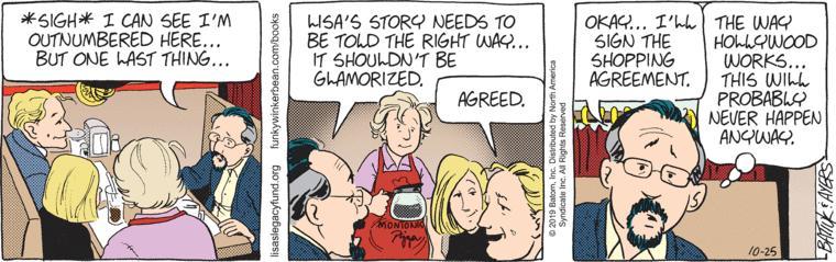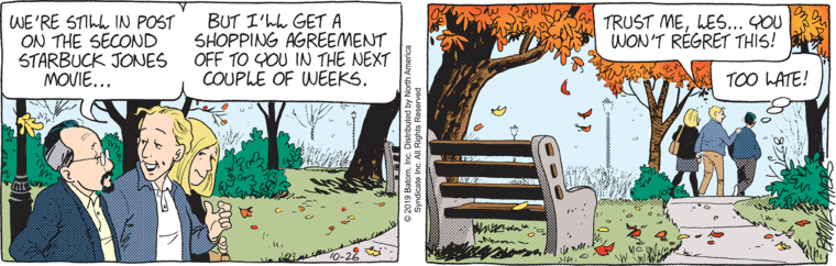 Ugh, this is one of my least favorite parts of this strip. Something ostensibly good happens to someone (Les is getting paid money to make a movie out of their book, meaning there’s at least a chance a story he cares about will speak to people in a new medium, and at the very least more people will read the book, also MONEY, how does that not mean anything to a public school teacher with two daughters in their seventh year of college), and he reacts to it like he just sat on a turd and he’s too crushed with despair to do anything about it but moan.