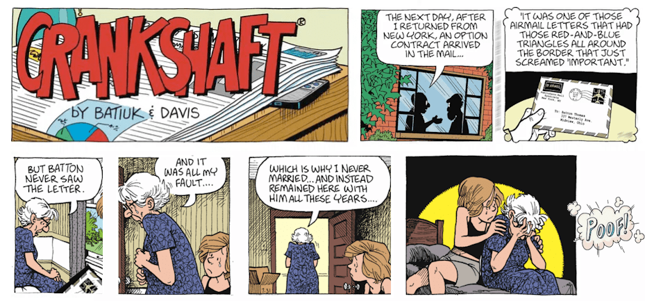 This week is a great example of something Epicus Doomus often says: Batiuk never runs out of new ways to be infuriating and boring at the same time. It’s recently become a sport for commenters at this blog to try and guess what the next week of Crankshaft will be about. Known future stories include the upcoming Pete-Mindy wedding; the trip to Winnipeg for a Blue Bombers game; a likely trip to San Diego Comic-Con in late July, even though post-Funky Winkerbean has pivoted away from Atomik Komix; the endless Skip-Batton Thomas interview; Cindy’s pregnancy at Age 75, which is entering its fifth trimester; and standard Crankshaft plots.
