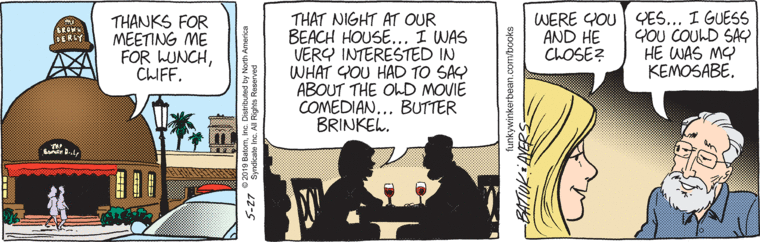 As for the strip before us, a cursory glance at today’s strip left me really puzzled. I thought, How in the heck could Crazy Harry be close to Butter Brinkel, someone who had probably died before he was born? Is this like his Tarzan fixation, where his obsession with the character led to said character coloring his world? Just because he owns all the DVDs? And how could he afford to fly out to Los Angeles?