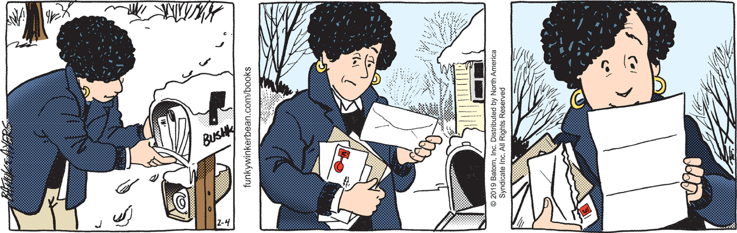 Sigh. Bull went for a stroll (and apparently came back already), Linda got the mail, so naturally the Great Story Ruiner had to slam on the brakes and slow things down by spending an entire mid-week one-paneler on Linda dramatically looking at a letter. Nicely done, Spoiler Boy, nicely done. Obviously this is a BIG DRAMATIC MOMENT where Linda is about to receive LIFE-SHATTERING NEWS right there in her WEIRDLY HAIRY LIVING ROOM which makes me seriously queasy to look at. We get it, it’s fabric, a standard sofa and carpet component. This is a comic strip that often forgets it once jumped ten years ahead, I doubt any longtime FW readers would wonder to themselves “hmmm, I wonder if that sofa and that carpet is made of a fabric-like substance?” if the gross hair-indicator squiggles were omitted. It’s like those coffee steam lines, there’s no reason to specifically note that the beverage is hot unless that’s actually part of the story, which it almost never is. It’s one of the most annoying things about FW in my opinion.