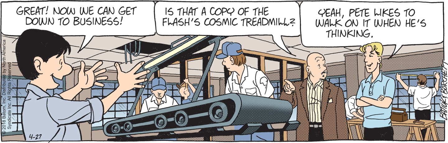 Anyway, it’s Boy Lisa’s stupid treadmill, not Pete’s, so when and where he used it to “think” is (sigh) yet another never-to-be-solved Batom anomaly, like Becky’s mom or the Food Film truck scam or what year it’s supposed to be. It’s best not to think about it too much, but it’s tough when he gives you so precious little else to focus on.