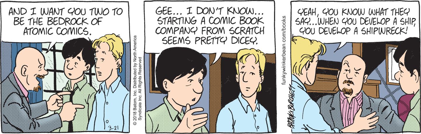 Who “says” when you build a ship you’re building a shipwreck? Remind me to avoid Batom Inc.’s ship-building division, please. I mean wow, talk about a negative approach. When Funky builds a pizza is it standard to expect a few hairs in it? When Les teaches a student are we to expect that student to be an illiterate dolt? When Masone makes a film should he expect it to bomb horribly? When a comic strip writer puts together a five week long arc about starting a new comic book company should it culminate with the lead characters shrugging indifferently? The constant smirking and wry wordplay belies the sick and disturbed darkness at the heart of this strip. These people, always with the dropping shoes.