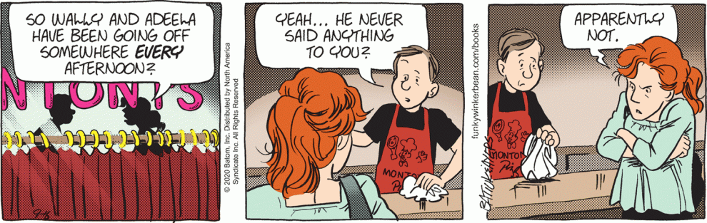 Today’s content just repeats yesterday’s–imagine that–Rachel getting more and more miffed by unexplained behavior by Wally. As newagepalimpsest pointed out yesterday, this would be a typical scenario in an Archie comic.