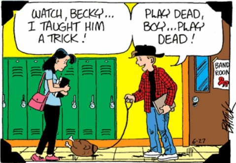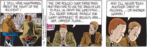 Wally returns home in summer 2009 and takes a job at Montoni’s February the next year, but we get no strips of Wally and Kahn in a panel together because Batiuk is boring and unimaginative and I hate him.