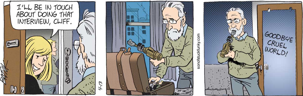 What if Mason doesn’t have enough clout to recast and rewrite Starbuck Jones on the fly (c’mon, a guy whose signature role to date was in something called Dino Deer)? Perhaps Jarr’s come as unmoored from reality as the comic strip in which he’s a character, and he just thinks he’s pulling all these strings. I don’t have any better understanding of bipolar disorder than does Tom Batiuk, who labeled Mason as such merely to set up a cheap gag, but maybe he’s having one of what you call your manic episodes. In his head, anyway.