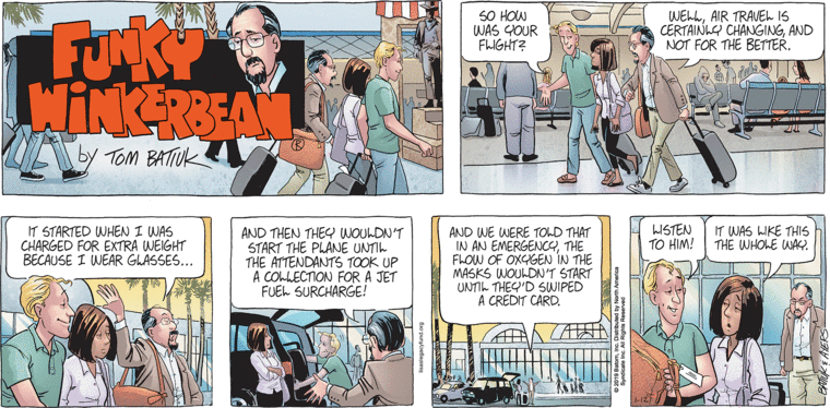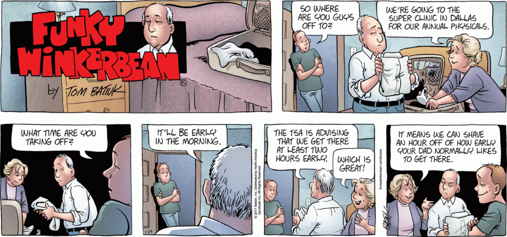 Is Funky telling the truth in today’s strip? Last time we saw him get a physical was in early 2017, when he and Holly flew to Dallas (sure…) to visit a so-called “superclinic” (sure… again) for physicals. Well, Holly claimed it was an annual physical back then, so maybe the Winkerbeans’ annual January Dallas superclinic physical trip just recently happened. Not sure when that would have been, we’ve seen Funky and/or Holly every single week so far this month…