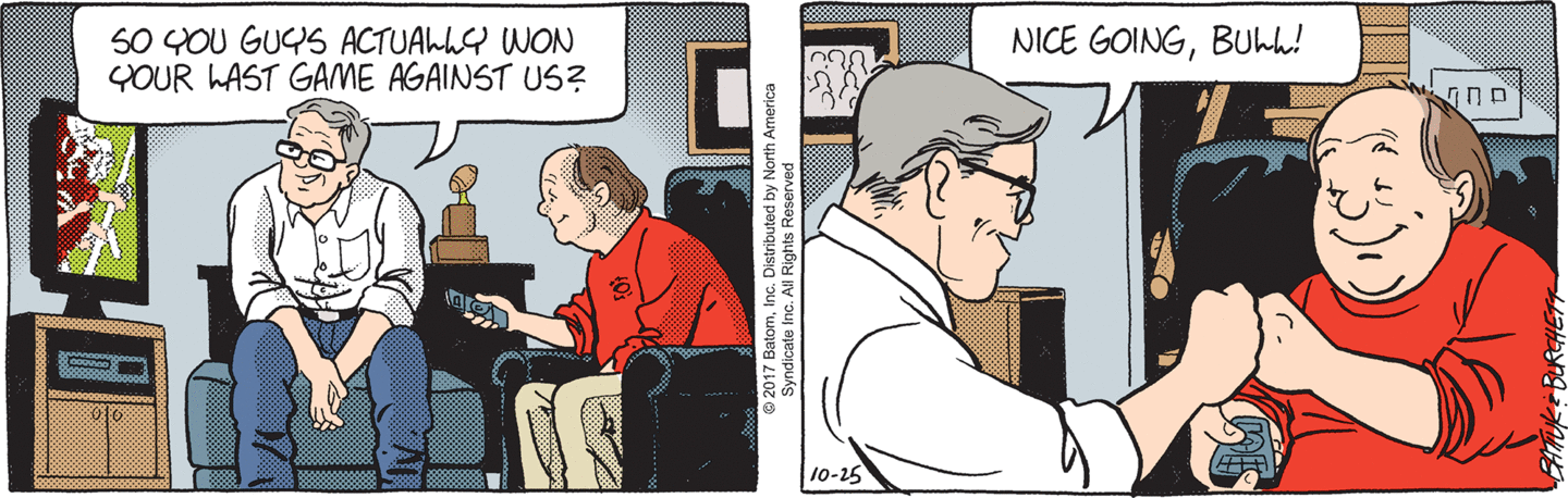 Oh, so now Linda wants Bull to do something other than binge videocassettes and relive his days as the best player on a winless high school football team? In today’s strip, she has finally decided to stop enabling him and wants him to do something he has not done since, uh…