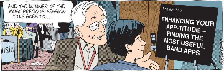 Today’s strip begs the question, if Lefty has to print 47 pages of things not to do for her band students, why is she taking them all to Columbus for the Ohio Music Educators Conference? Or rather, why is she taking any students at all to the Ohio Music Educators Conference? I guess they make preferable company to her typical OMEA companion Dinkle, but so does a moldy dish towel. I would take bets on whether or not the kids’ presence at the conference ultimately gets explained, but I cannot find any casino willing to give me odds on “yes”.