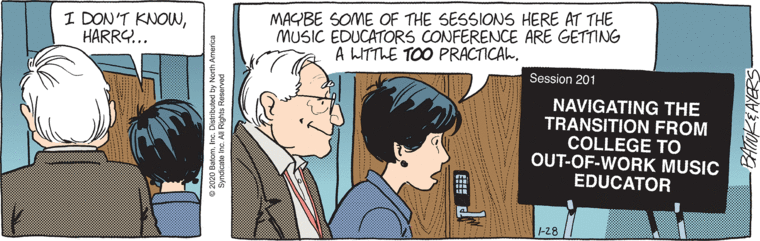 Uh, Dinkle? Literally ZERO of these sessions have practical applications for you. You’re retired. You are no longer a music educator. The only reason I can imagine they still allow you to attend these conferences is because you pay for it. The only session that would be practical for you would be “How to step away and fade into the sunset and let the current band director do her job, it’s almost as if a certain writer can’t let go and is terrified of having his Dinkle crutch”.