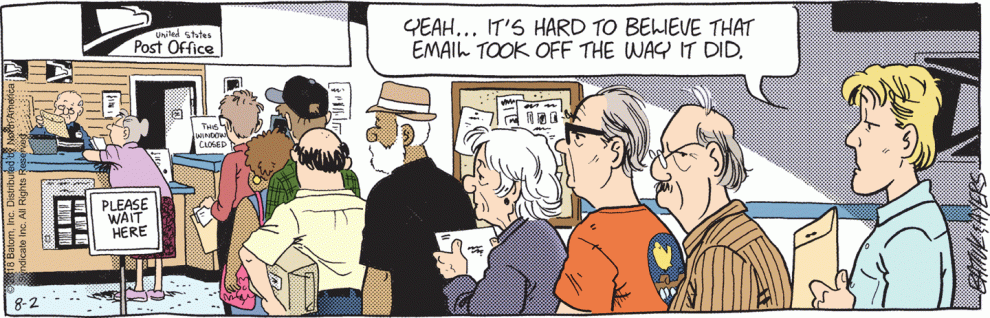 Well, Dullard’s li’l quip would have been quite the knee-slapper…in 1998, say. Nowadays, it reads a lot like Pluggers. Actually, it reads like a school-assigned book one has to write a report on for homework; yes, that dull. Yes, everyone uses email, but there are still long lines at the post office? For something people rarely use? Is this the joke?