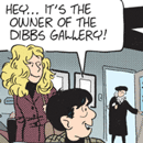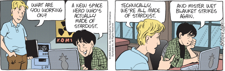 Last week’s running gag had Dinkle and Becky walking around reading signs. This week is shaping up to be a series of people letting themselves into the Atomik Komix office and being greeted with “Hey!” Superb draftsmanship today in panel 1: Kitch Swoon appears to be standing in the doorway of an airplane in flight, and Pete is so excited he’s morphed into Shemp Howard. Our colorist gives even less of a damn, leaving Ms. Swoon with white hair rather than the blonde hair she had when we met her last summer. At least Batiuk hasn’t altered or forgotten her name.