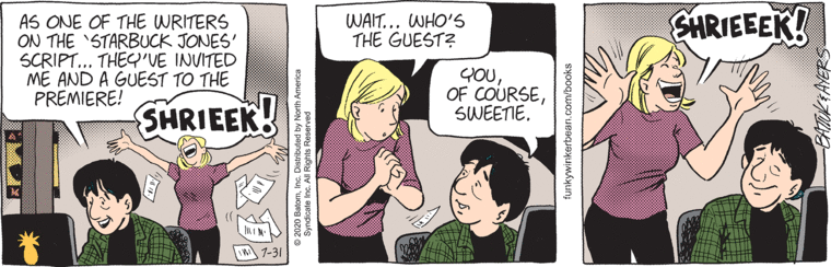As silly and lame as this story has been, I do like the second panel, where Pete’s girlfriend (fiancee?) is genuinely worried he’s not going to ask her to attend the red carpet premiere with him. Because of course she’s concerned he’d ask Darrin instead of her. I still think at least part of the reason she exists in this strip is because Batiuk finally realized how weird it looked having Pete and Darrin take trips together to buy dollies, and Darrin spending all of his time with Pete when his wife was staying in California for some unknown reason.