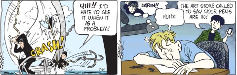 Today’s entry is kind of baffling. Seems to me he wrapped up the Pizza Box Monster arc pretty well yesterday, yet he felt he needed to add this weak coda. I guess he thought “CSI: Montoni’s” was too clever to leave out, but when it came time to write the strips he forgot to add it.
