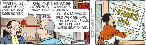 Wally returns home in summer 2009 and takes a job at Montoni’s February the next year, but we get no strips of Wally and Kahn in a panel together because Batiuk is boring and unimaginative and I hate him.