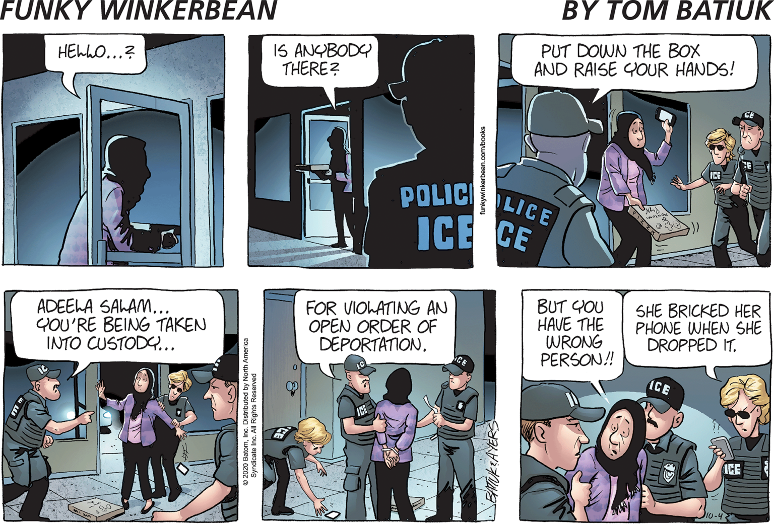 More interesting than Funky’s understandable concern for his restaurant’s assets or the icy glares of his family members is his continuing transformation into Gasoline Alley mainstay Slim in both attitude and appearance. Less interesting, of course, is Wally’s inability to use his phone to tell Funky that Adeela’s arrest had to do with her (mistaken) immigration status.