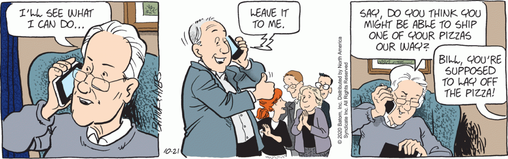 This guy still doesn’t look anything like Bill Clinton, but at least he’s game to help the gang in today’s strip, which means we’re probably closer to the end of this idiocy (and the start of a new idiocy). A President Clinton junk food joke? Really, TB? Did you write this in 1994 or when people stopped laughing at the thought of the President eating French fries (which was 1995, I believe)?