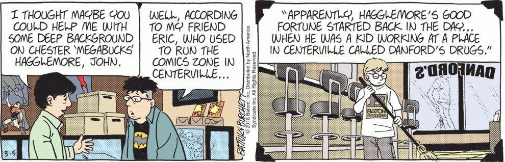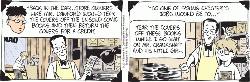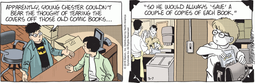 Surely, in Tom Batiuk’s world, Chester’s scheme makes him an awesome hero. I seem to recall reading something in Batiuk’s blog where he talked about taking comics from somewhere–I think it was a barber shop?–because they weren’t appreciated there anyway. Chester’s going a step further–he’s saving these books from destruction, not just neglect.